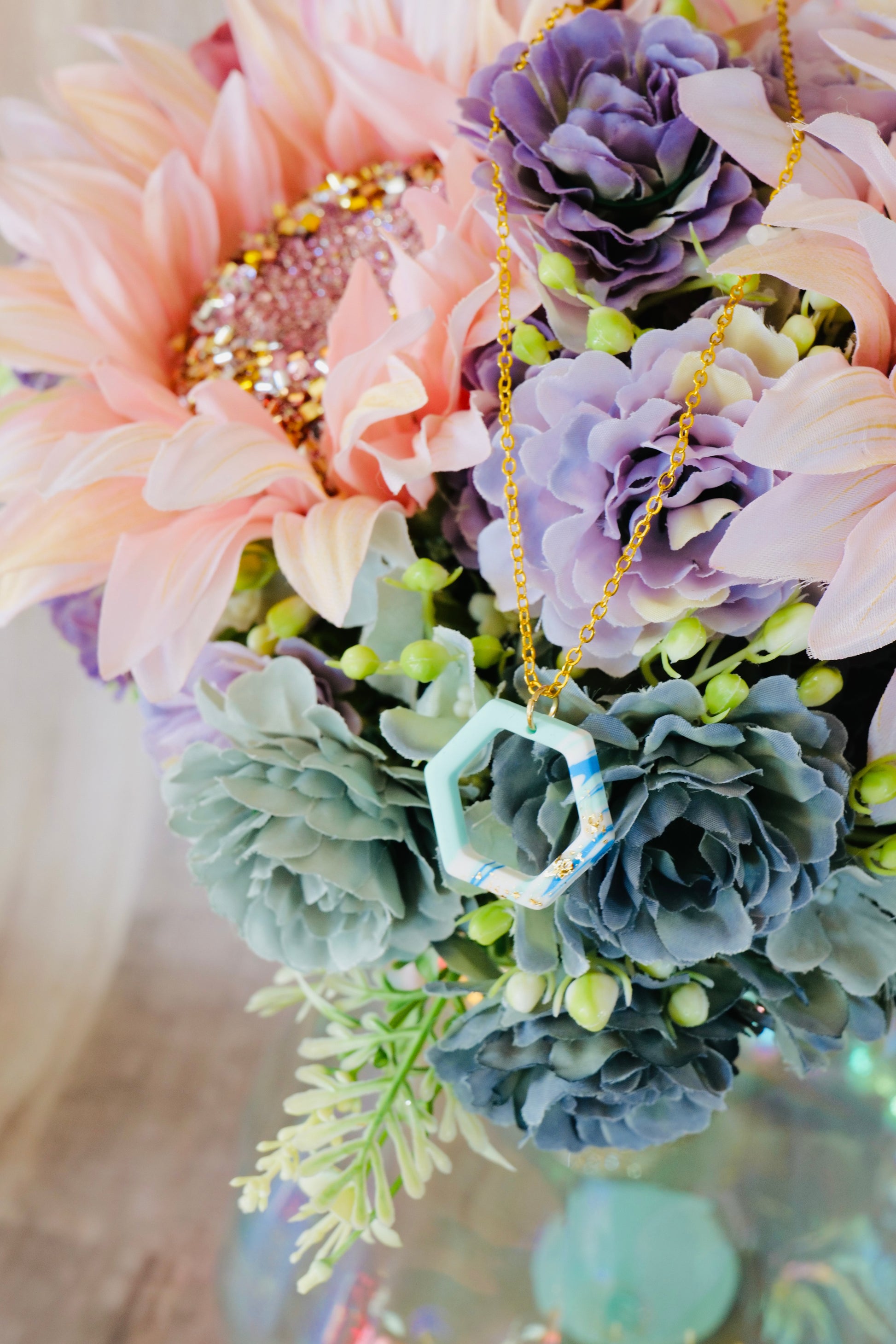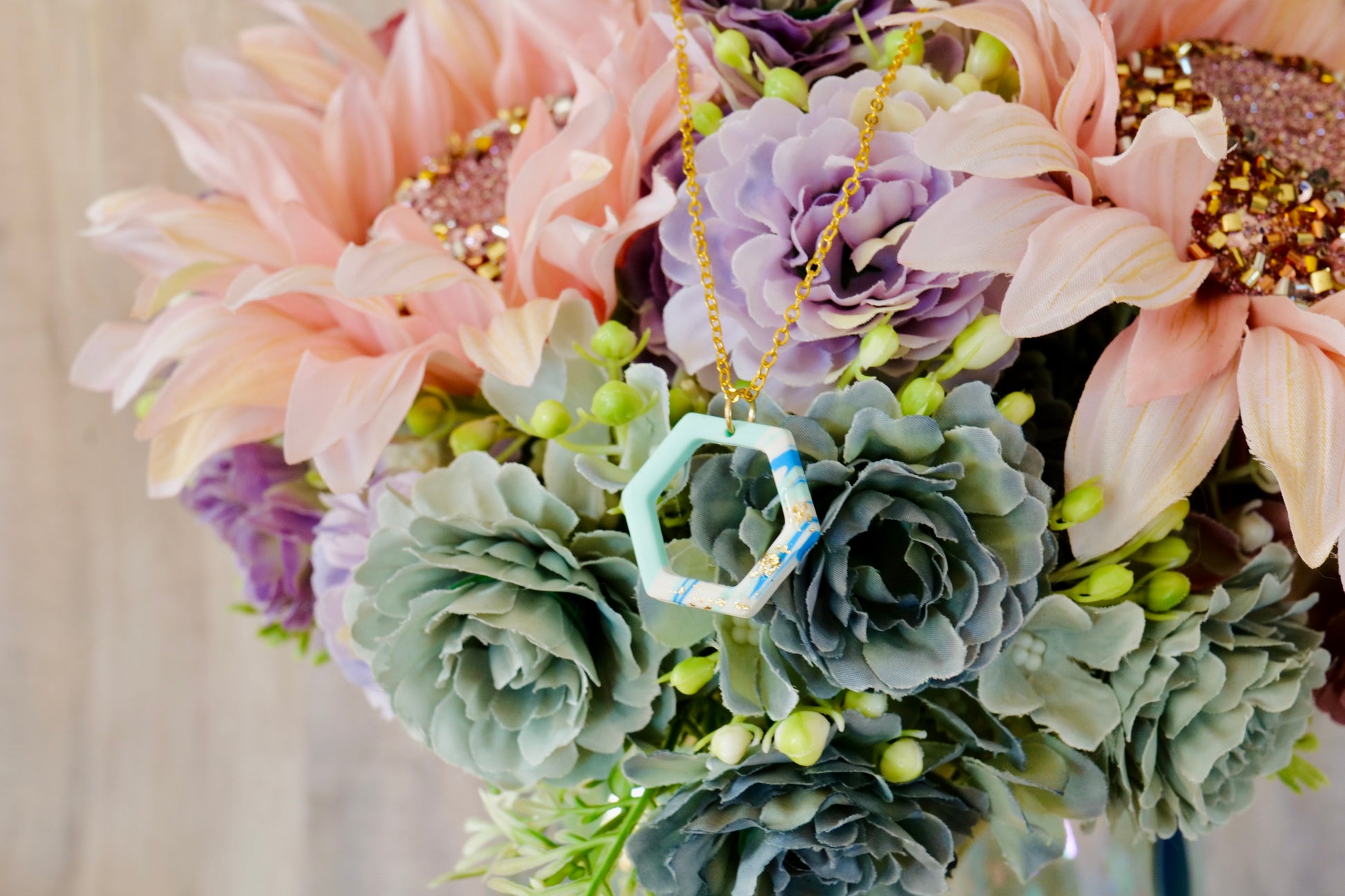 Featuring an 18-inch gold-plated chain, this piece is both modern and elegant. The striking pendant, measuring 1 inch tall and 1 inch wide, showcases a stunning blue design framed in gold, adding a pop of color and style to any outfit.