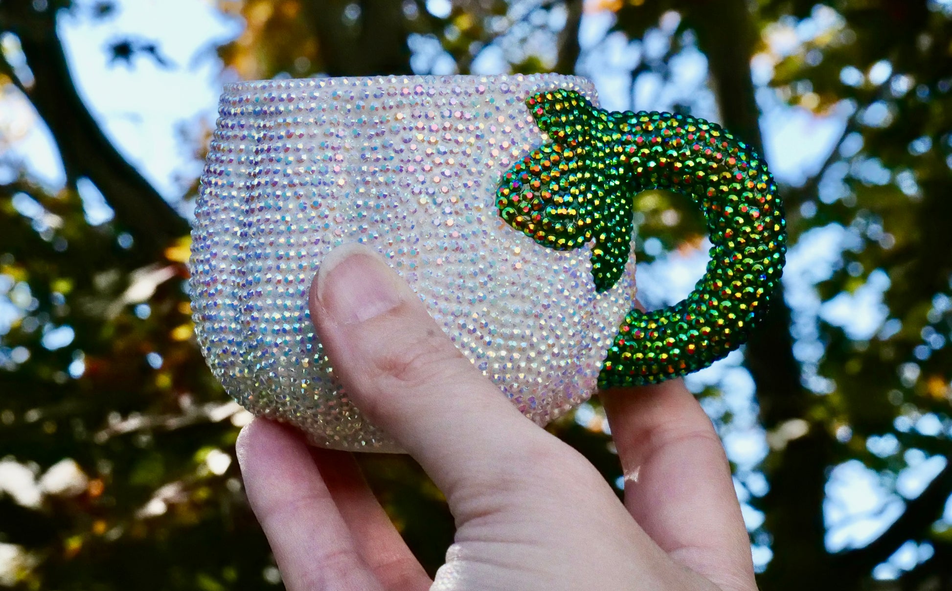 Each mini cup is hand-decorated with hundreds of iridescent rhinestones that shimmer in the light, featuring a glittering green stem handle for the perfect touch of fall charm. Ideal as a seasonal accent for your home, desk, or shelf — this piece brings cozy sparkle all year long 🧡