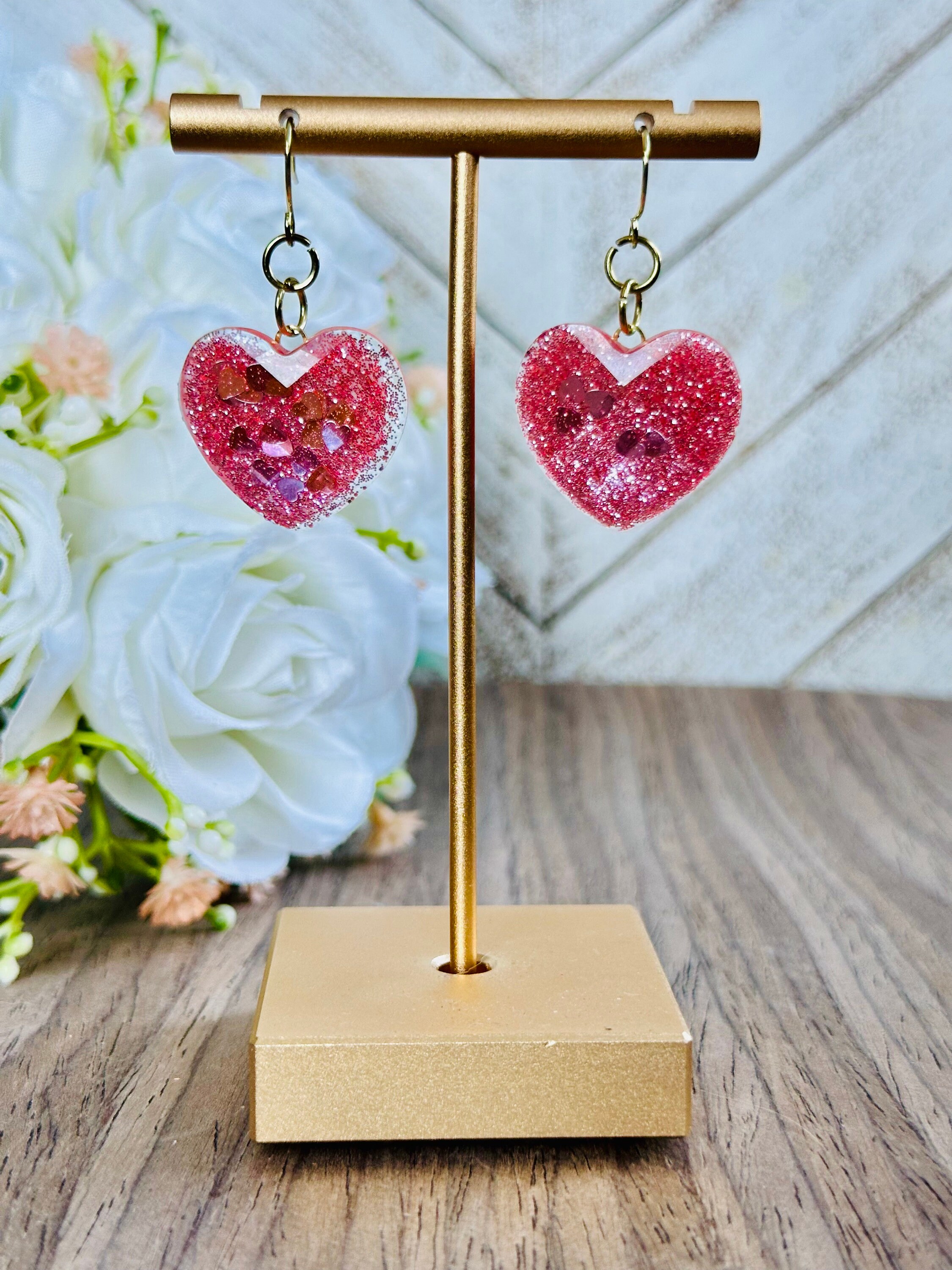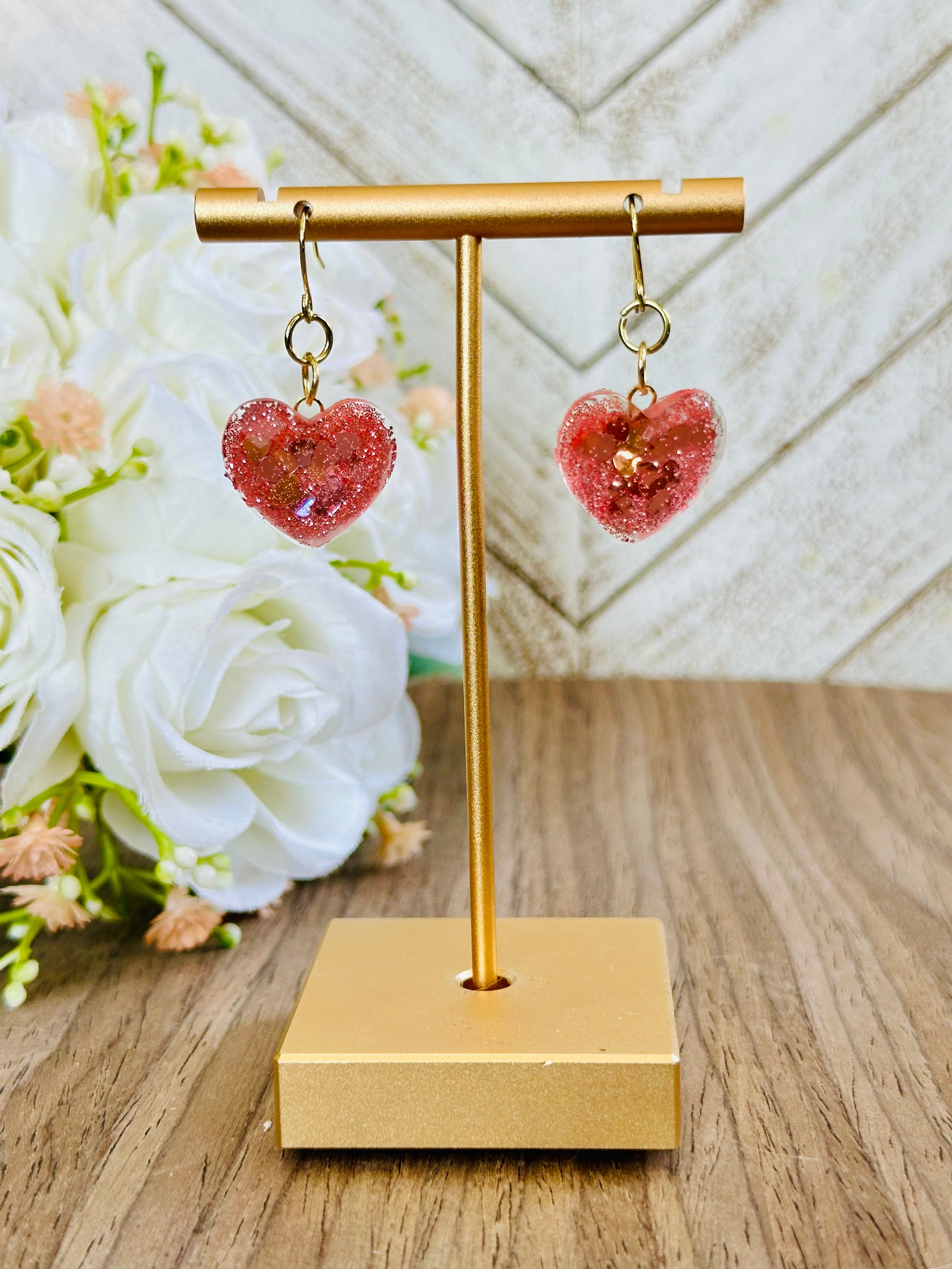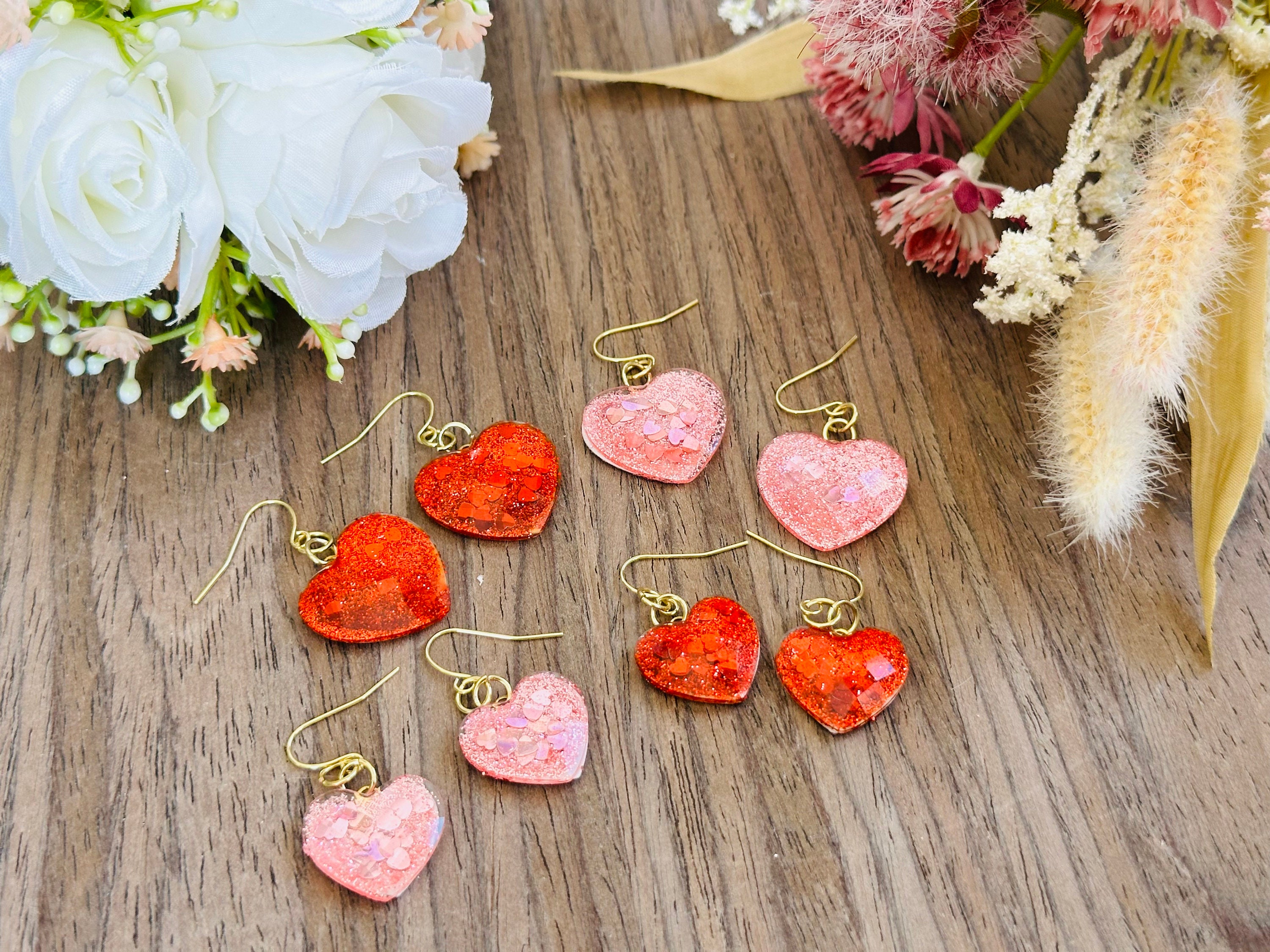 Glitter Heart Earrings | Red & Pink Resin Dangle Jewelry | Cute Statement Gift for Her | Valentine’s or Everyday Accessory