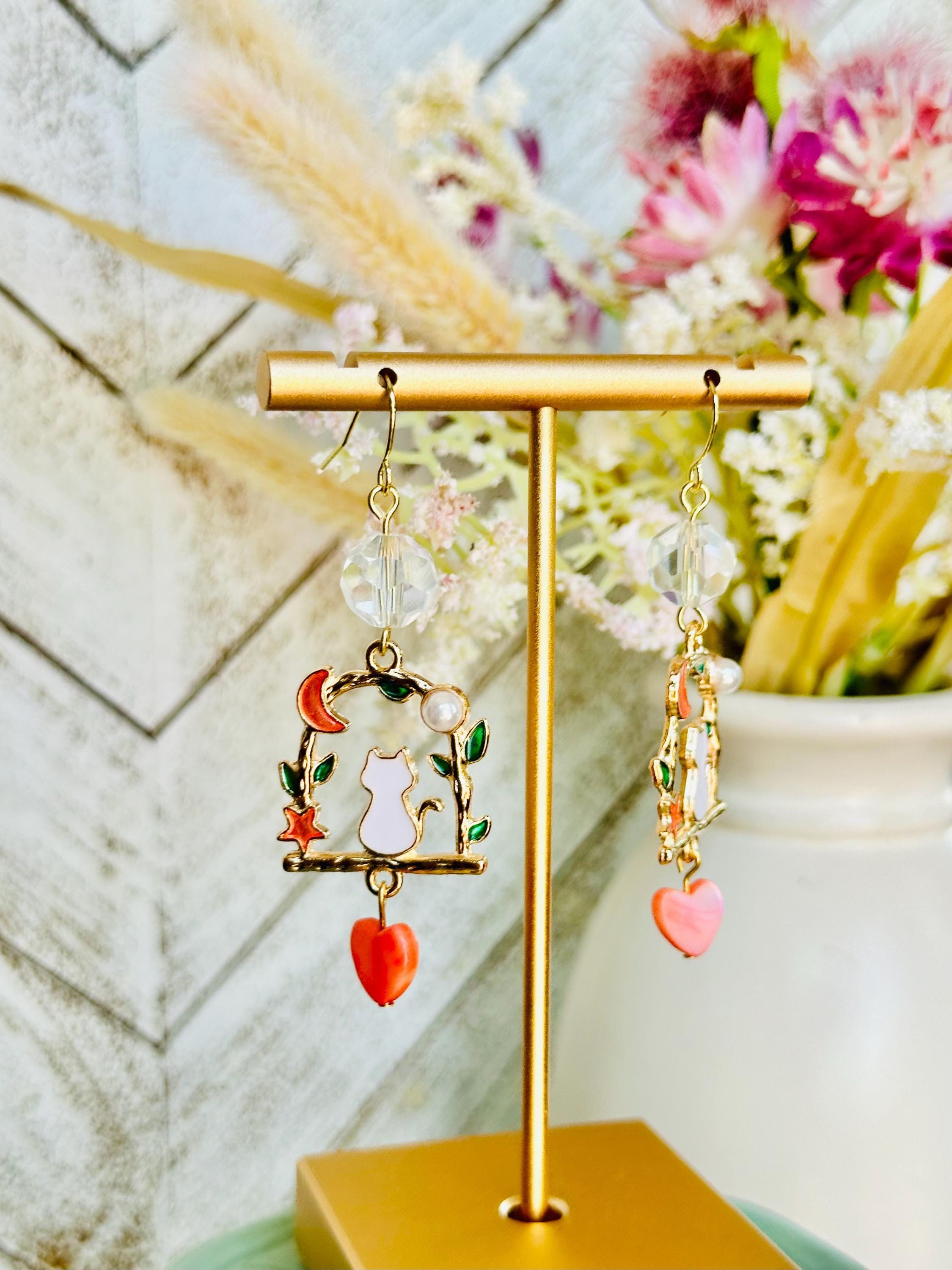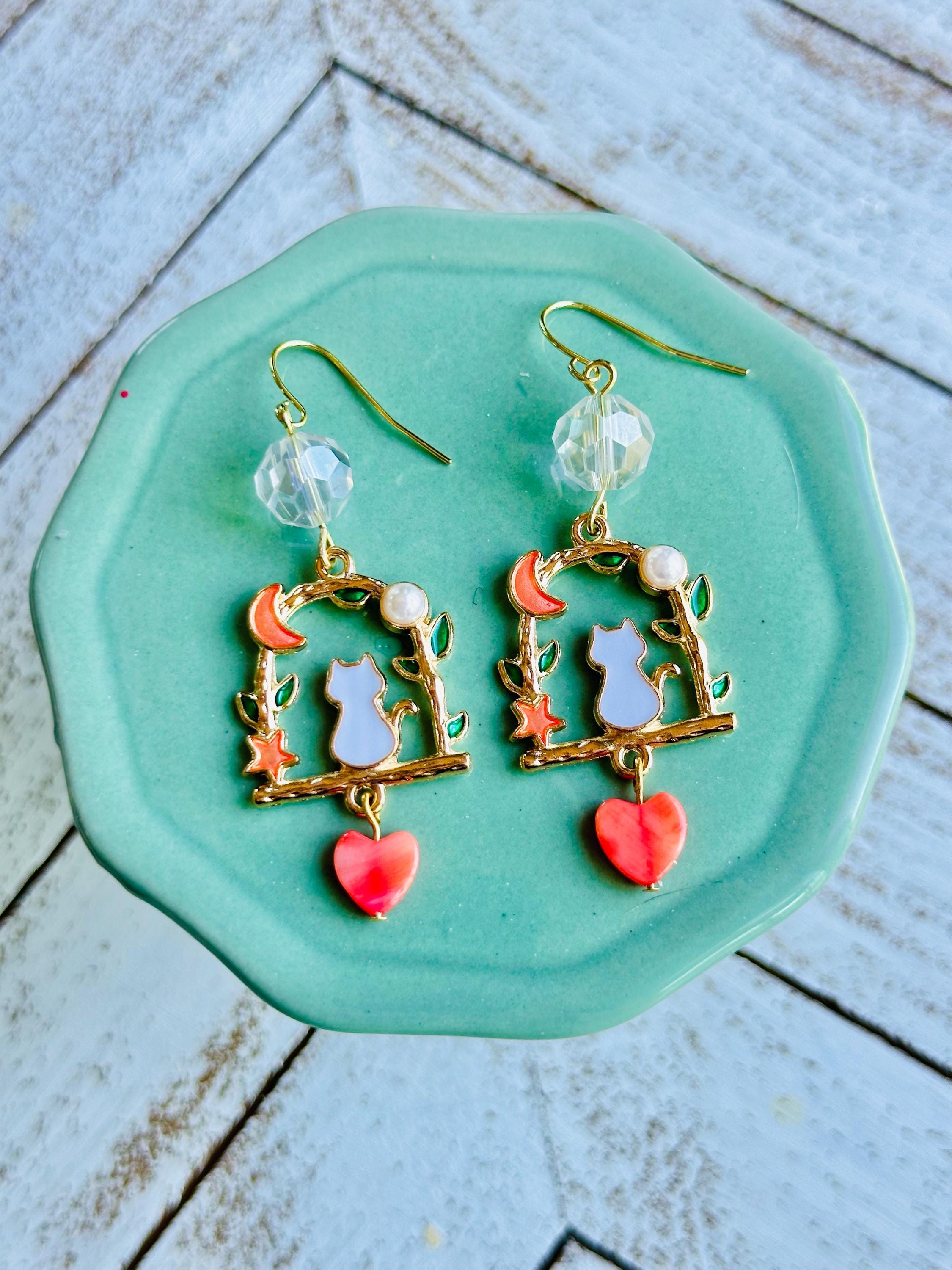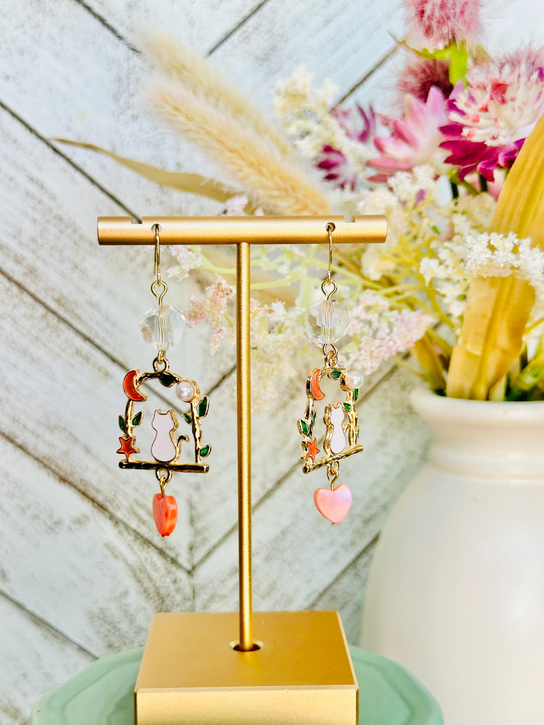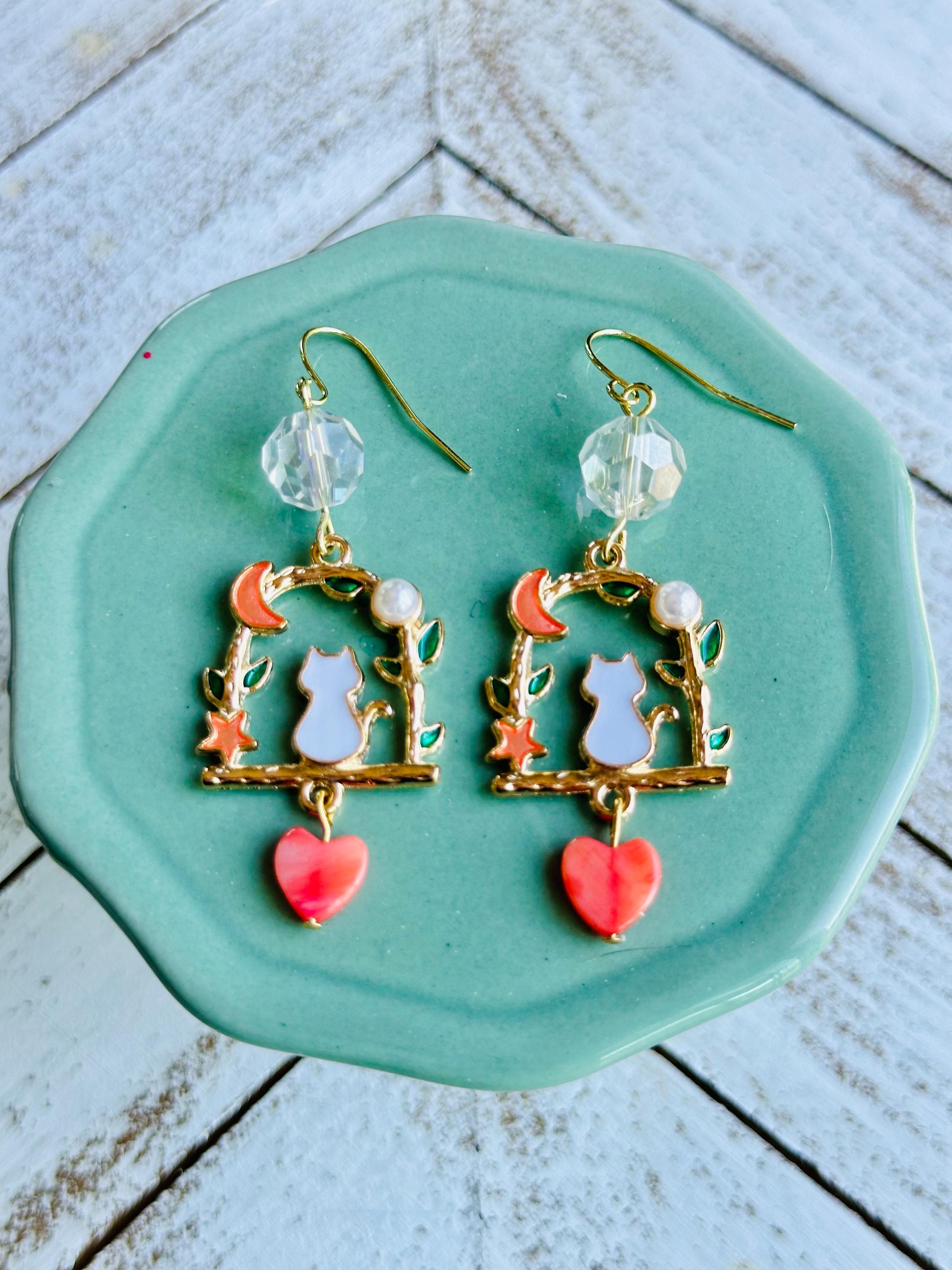 These charming earrings feature a whimsical design with a white cat perched on a gold-tone branch, surrounded by delicate green leaves, a crescent moon, and a coral heart charm. The faceted crystal bead adds an extra touch of elegance.