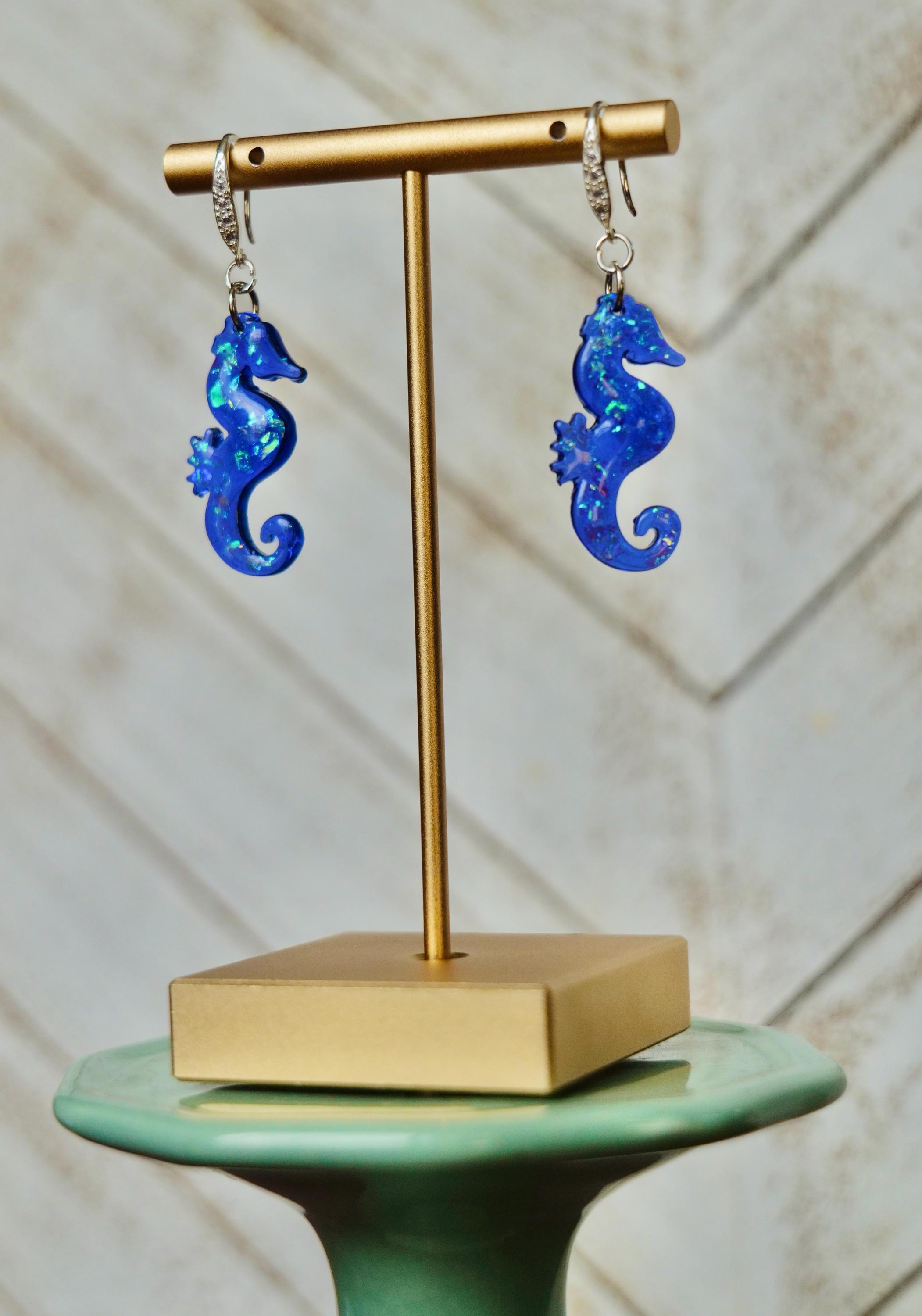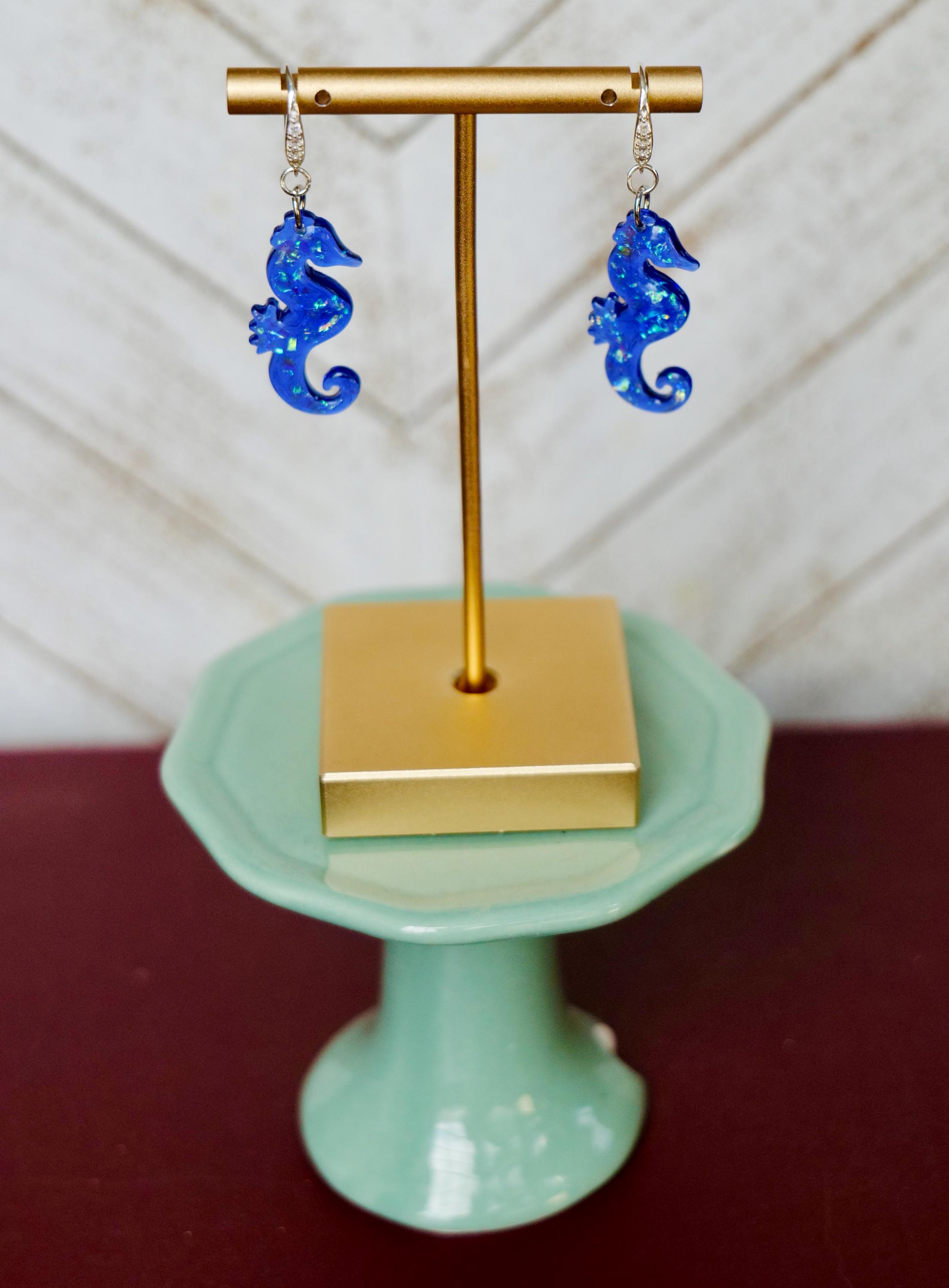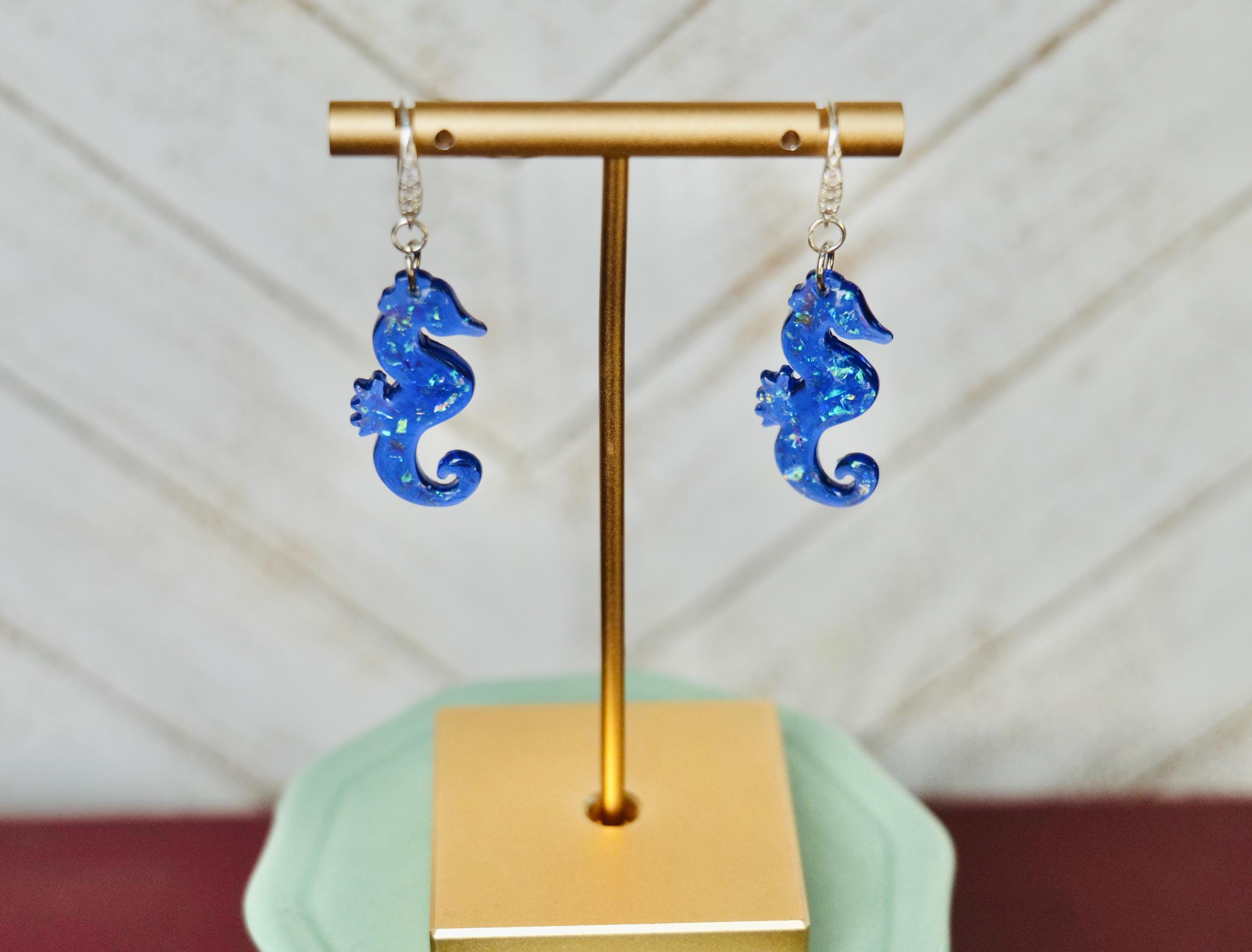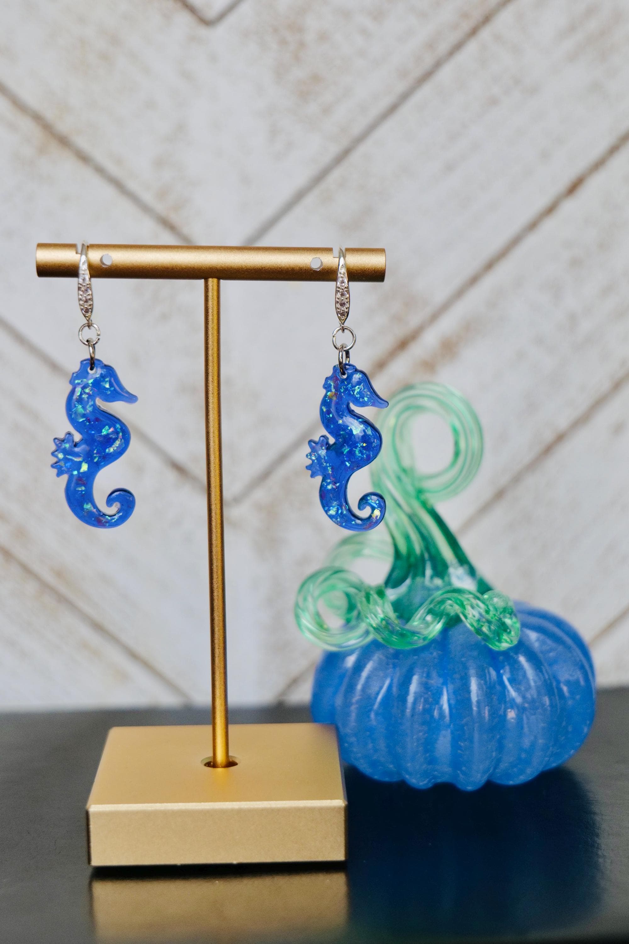 Add a touch of oceanic charm to your outfit with these stunning blue seahorse earrings.
