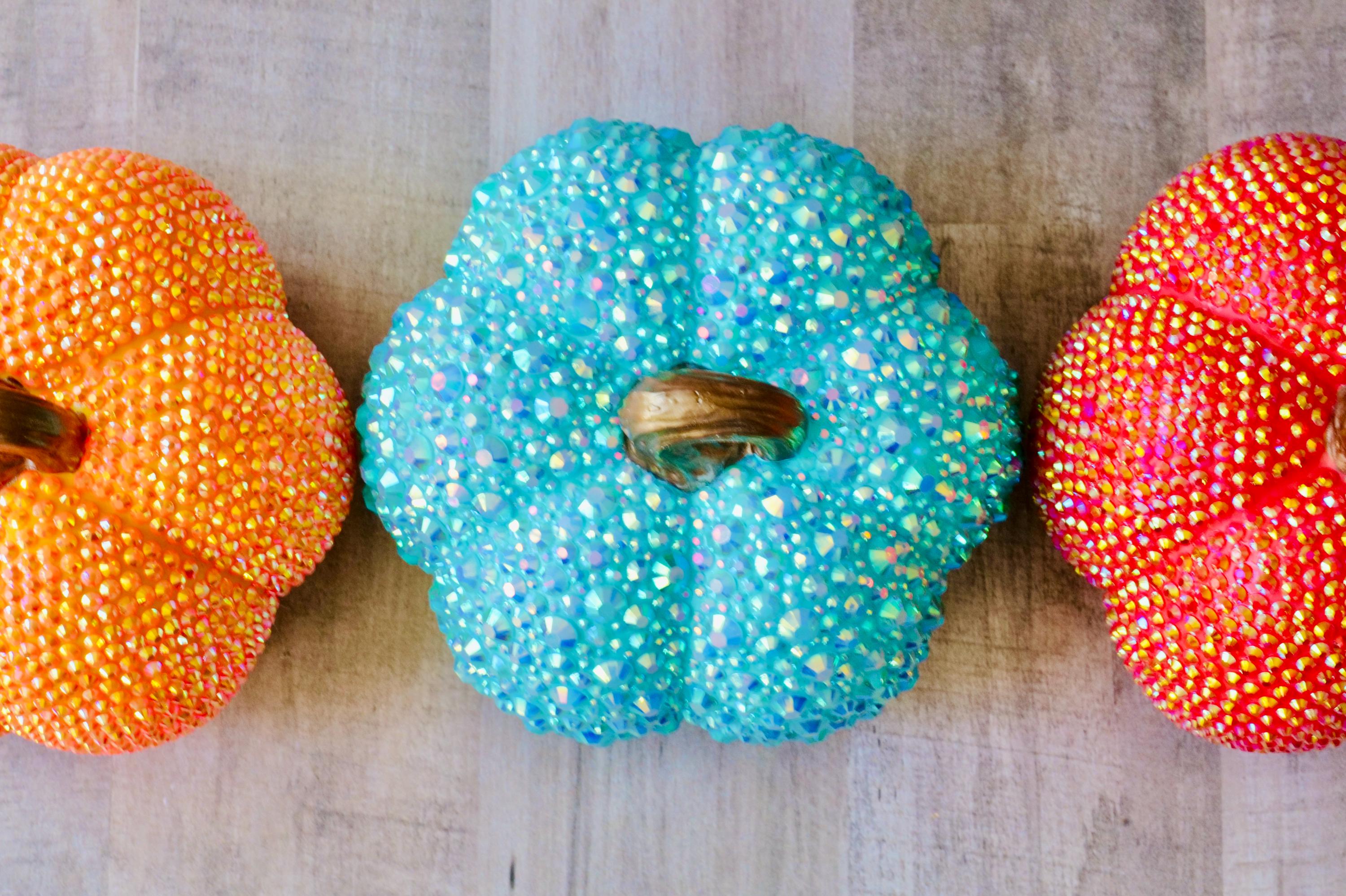 Add a pop of festive flair to your decor with this bright rhinestone pumpkin! ๐